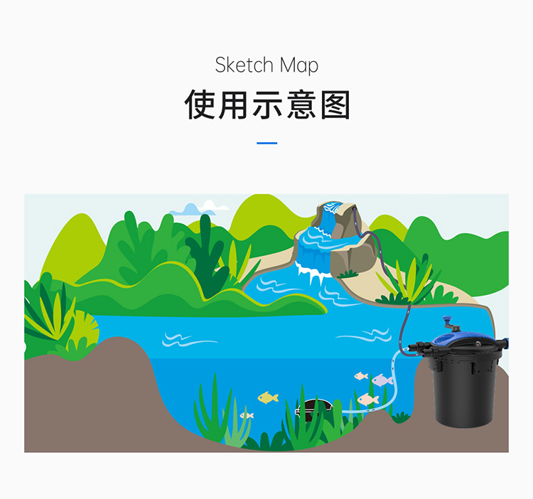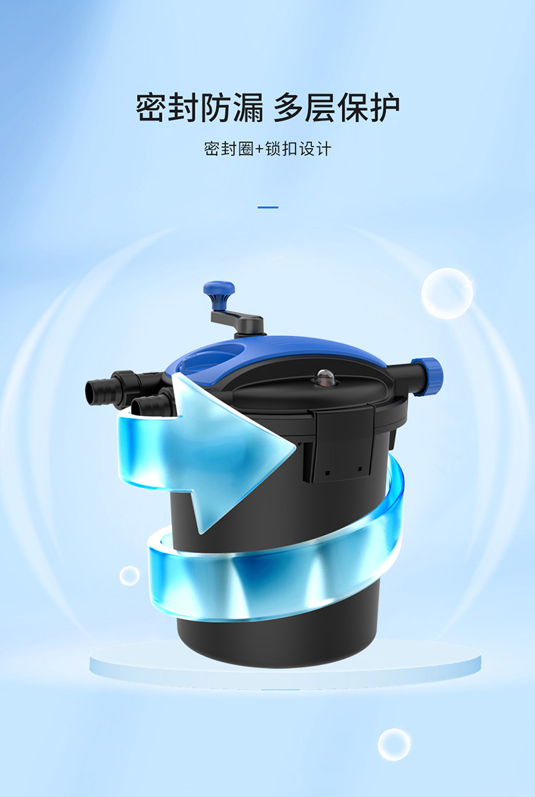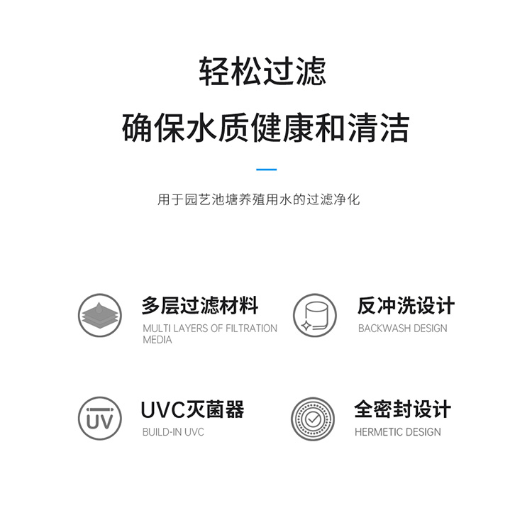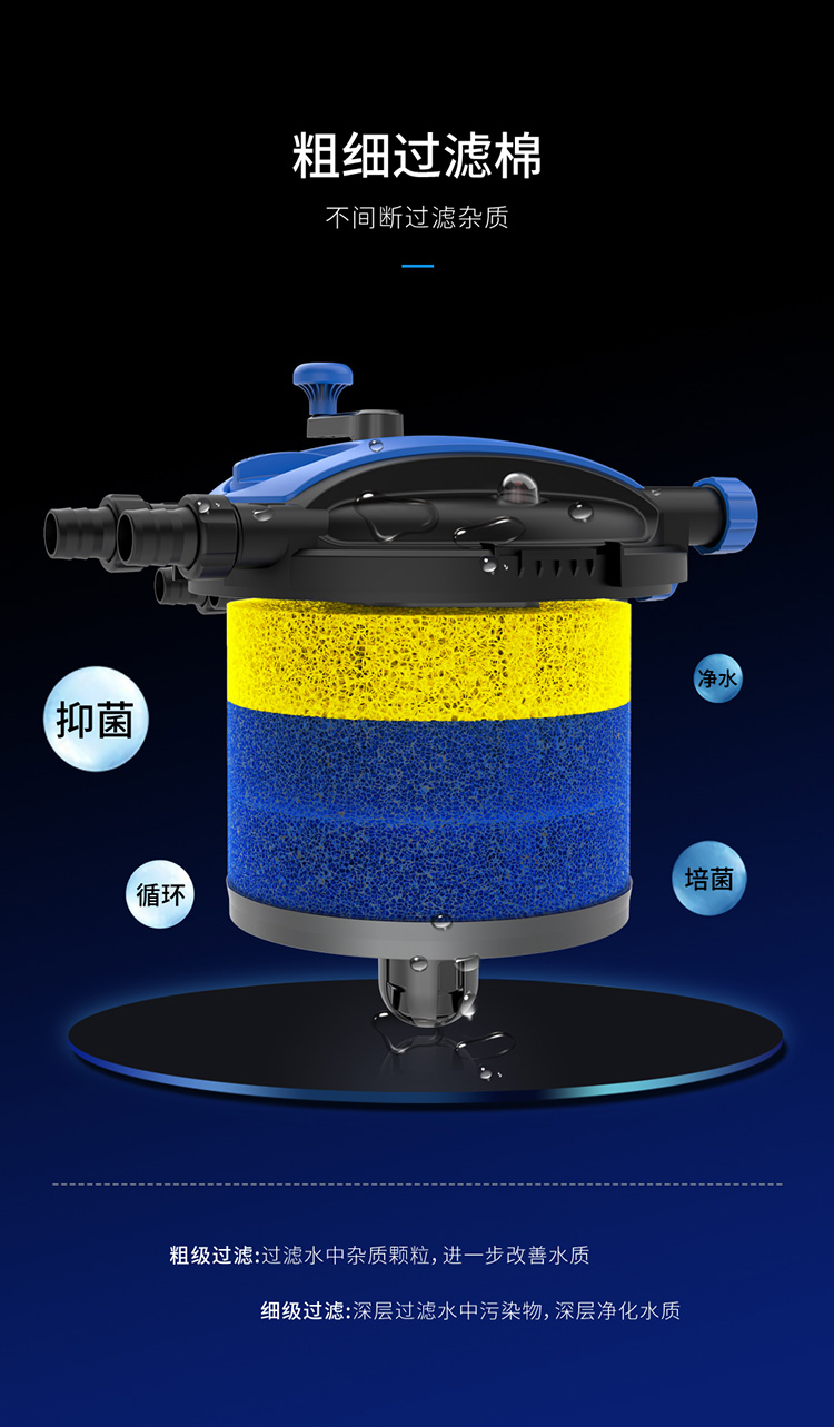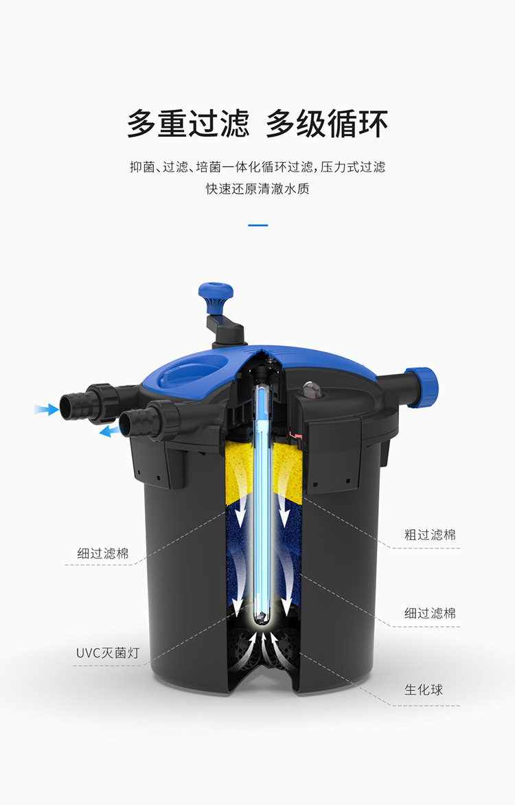 • 內置式紫外線燈,能有效地殺死水中的藻類、病毒及有害菌;